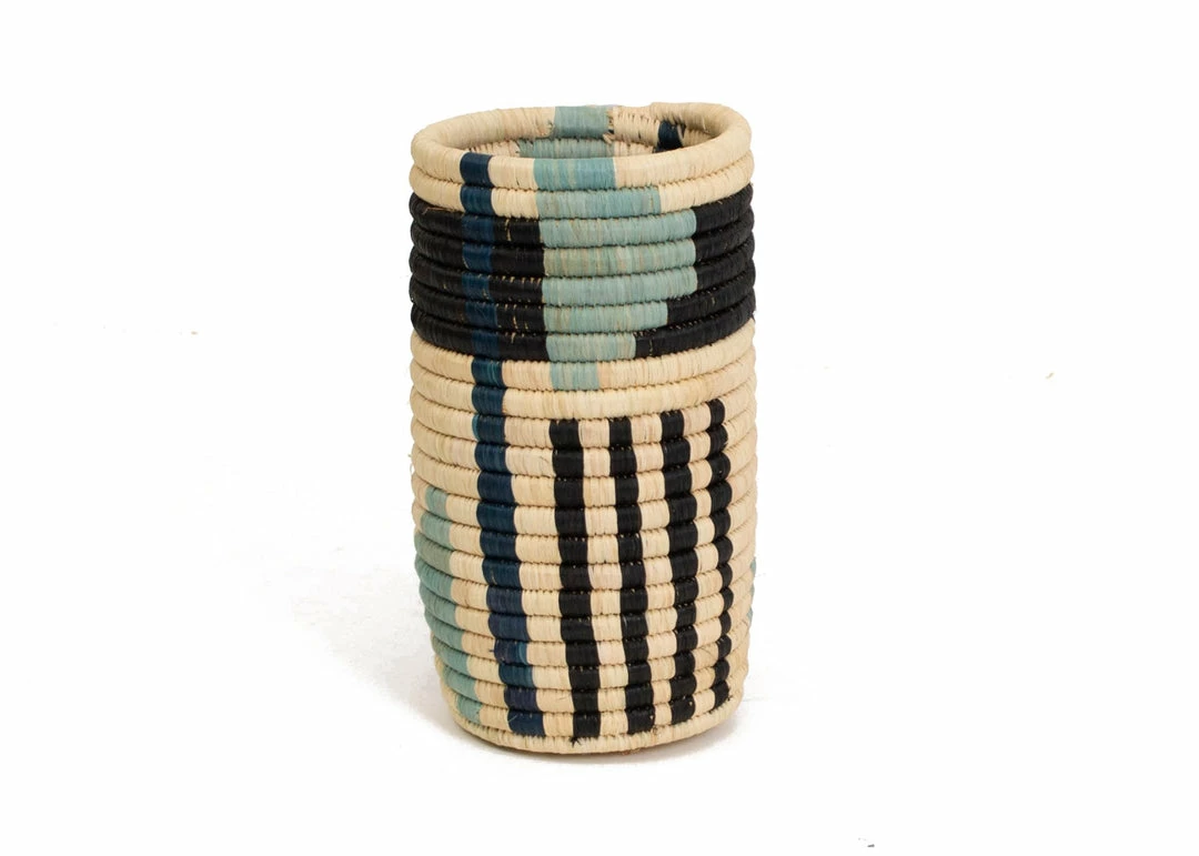 Intricately crafted with timeless tradition, this carefully dyed raffia fiber and sweet grass cylindrical vase makes a stunning statement piece. One or more of these vases will make a globally conscious and stylistic addition to your home. Our medium vase comes with a glass liner from the collection to display a bouquet of flowers or a plant. Alternatively this vase can be used to hold a bottle of wine, desk supplies, or kitchen utensils.