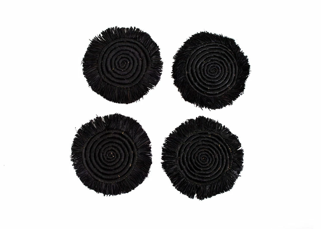 Intricately crafted with timeless tradition, this carefully dyed raffia fiber and sweet grass fringe coaster set makes a bold and exciting statement piece.