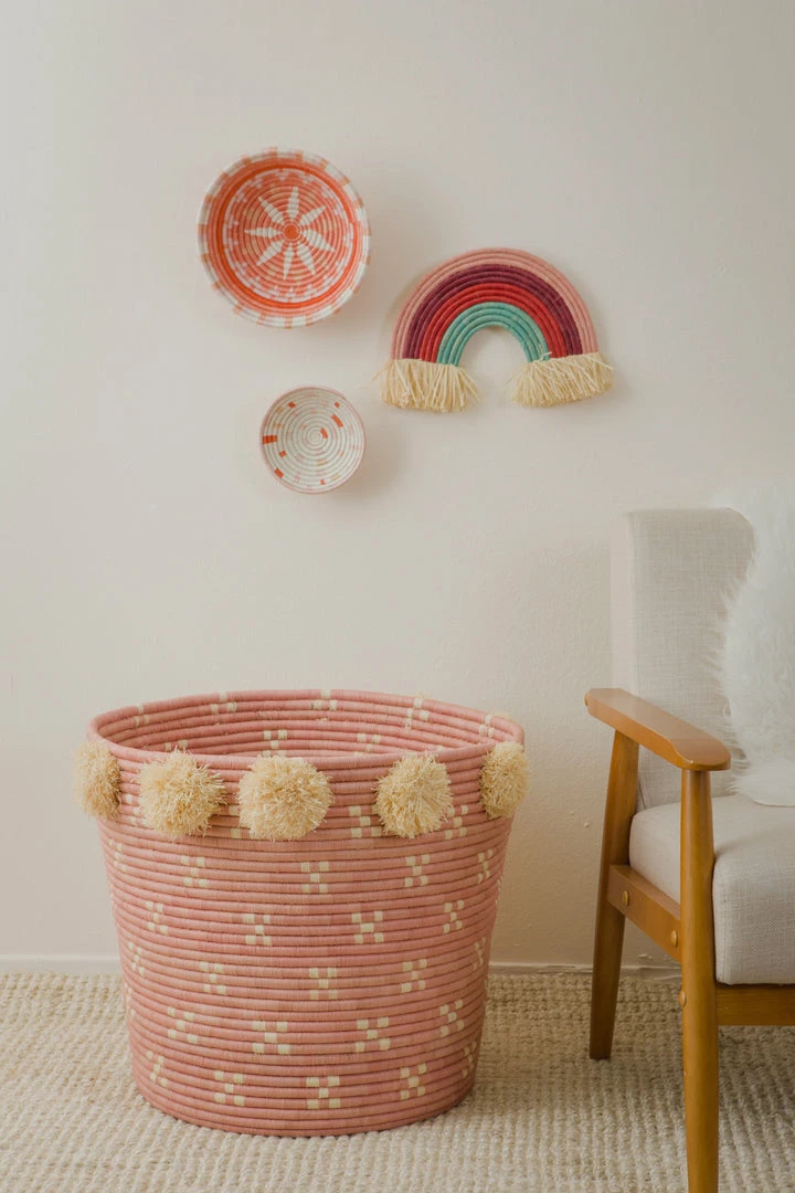 Intricate, functional, and globally conscious. Designed by Ashley Collett for her children’s line, Frolic, these charming hampers are the answer to your laundry and home organization foes! Stash toys, blankets, or laundry inside to quickly organize any playroom or childrens area. Made of the highest quality natural raffia fibers in an ethical, fair trade environment. Raffia is wound stitch by stitch around a small sweetgrass bundle. Handwoven over weeks by a woman in remote regions of Uganda.