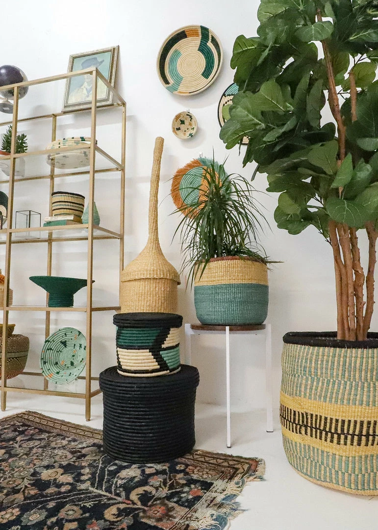 These delicately textured and handcrafted baskets were made by groups of women in intimate communities across Uganda. They use the raffia plant and sweet grass to weave them together.