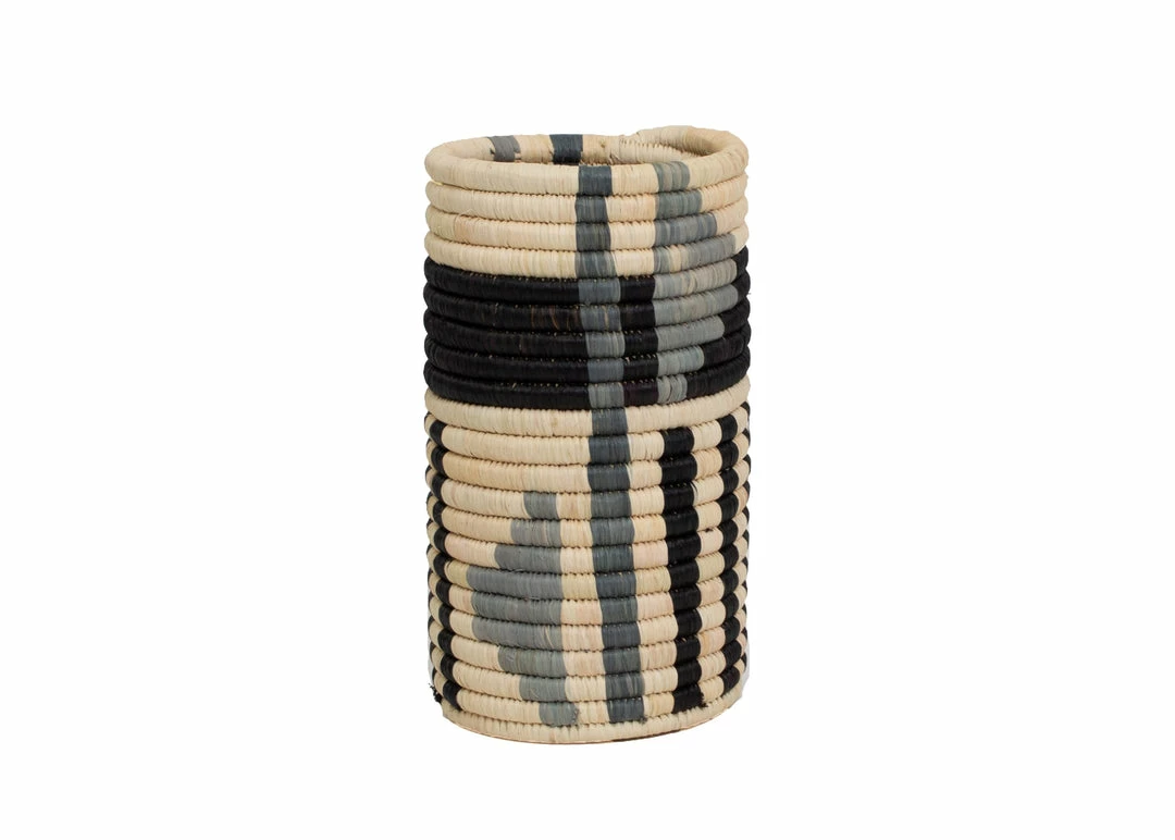 Intricately crafted with timeless tradition, this carefully dyed raffia fiber and sweet grass cylindrical vase makes a stunning statement piece. One or more of these vases will make a globally conscious and stylistic addition to your home. Our medium vase comes with a glass liner from the collection to display a bouquet of flowers or a plant. Alternatively this vase can be used to hold a bottle of wine, desk supplies, or kitchen utensils.