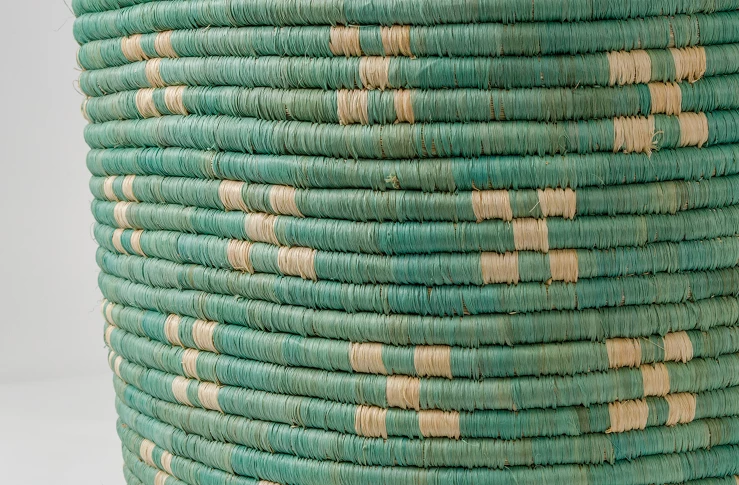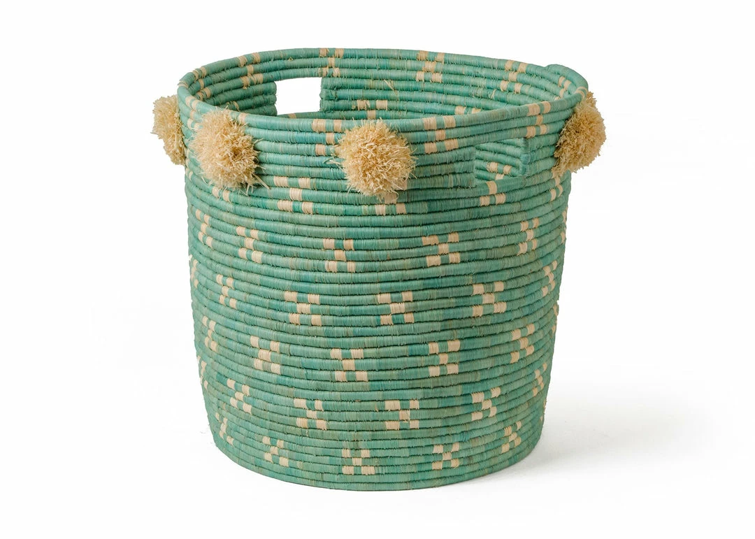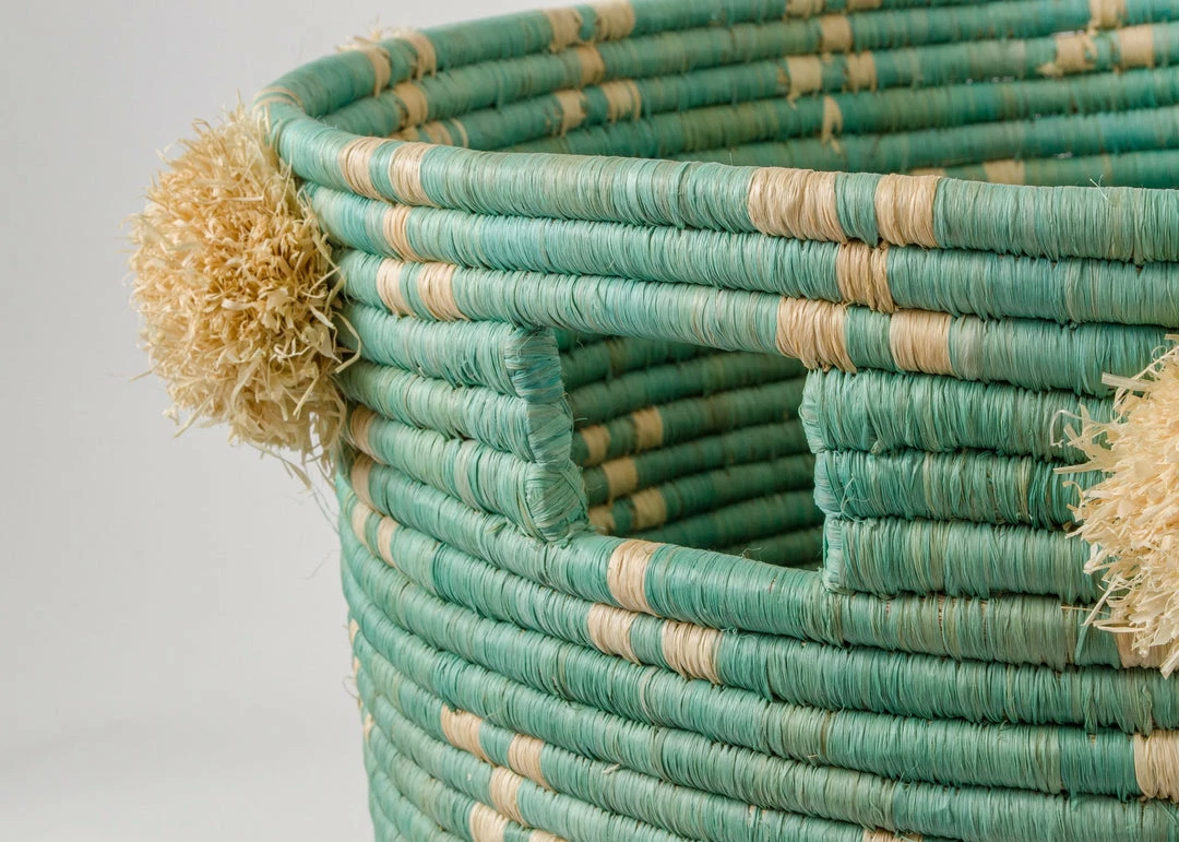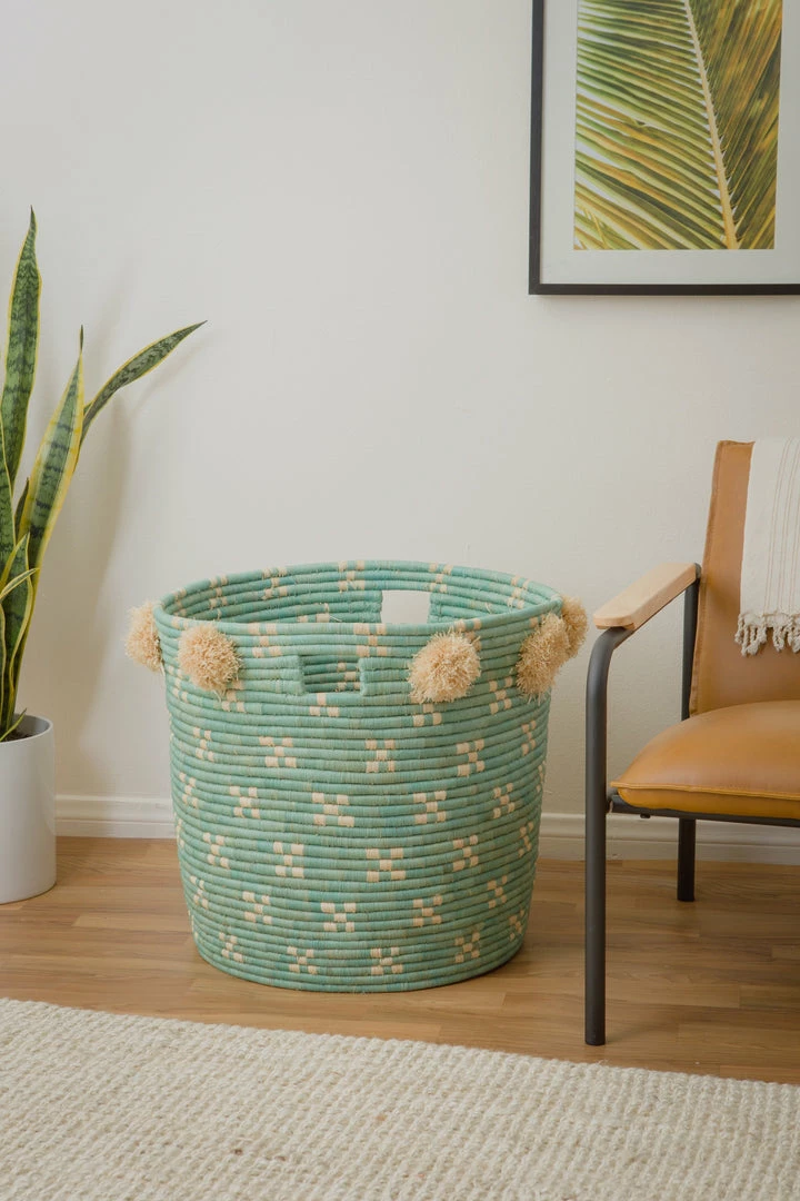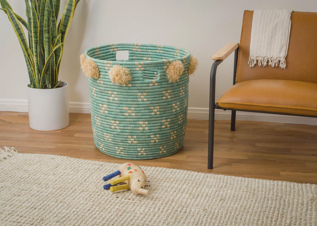 Intricate, functional, and globally conscious. Designed by Ashley Collett for her children’s line, Frolic, these charming hampers are the answer to your laundry and home organization foes! Stash toys, blankets, or laundry inside to quickly organize any playroom or childrens area. Made of the highest quality natural raffia fibers in an ethical, fair trade environment. Raffia is wound stitch by stitch around a small sweetgrass bundle. Handwoven over weeks by a woman in remote regions of Uganda.