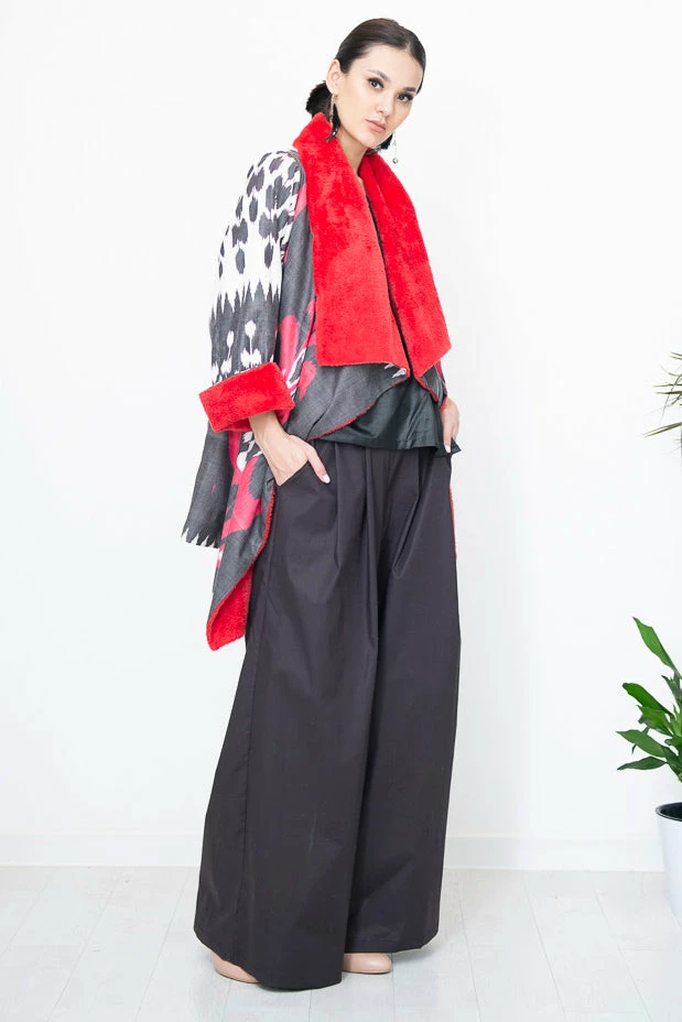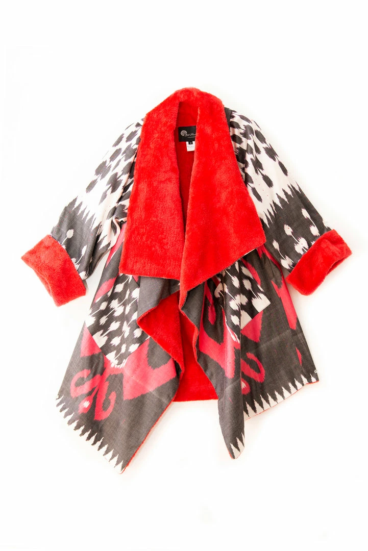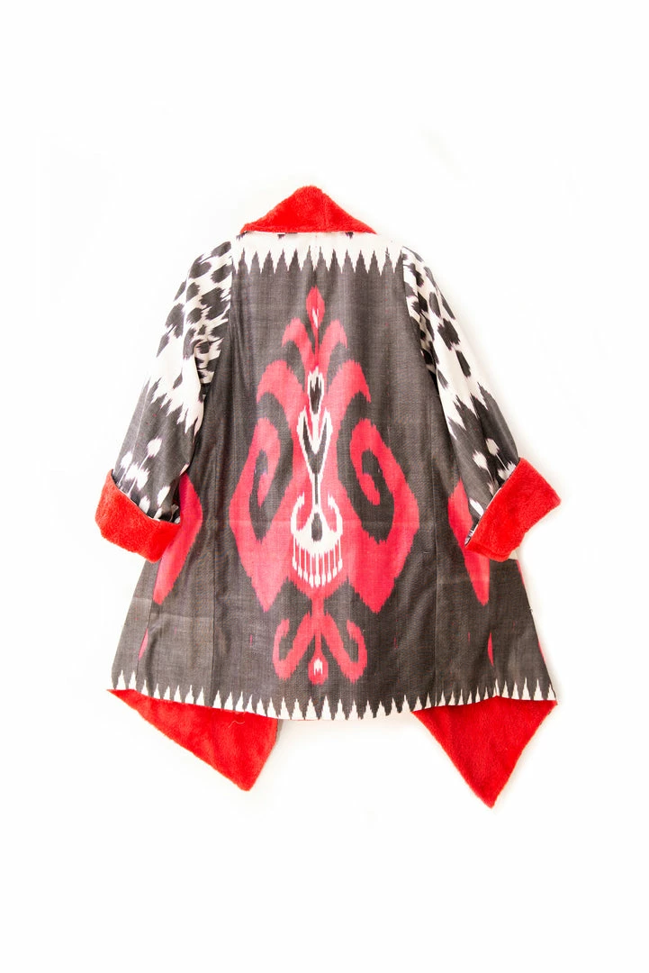 Asymmetric Ikat Jacket with its soft and light fleece lining features beautiful asymmetric cut along the collar and front. The jacket has patch pockets.Â
