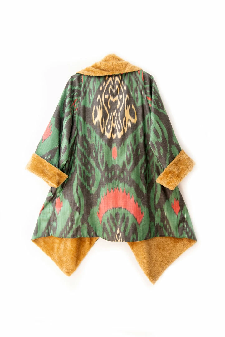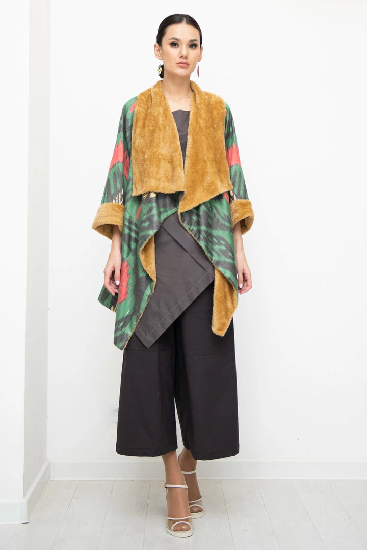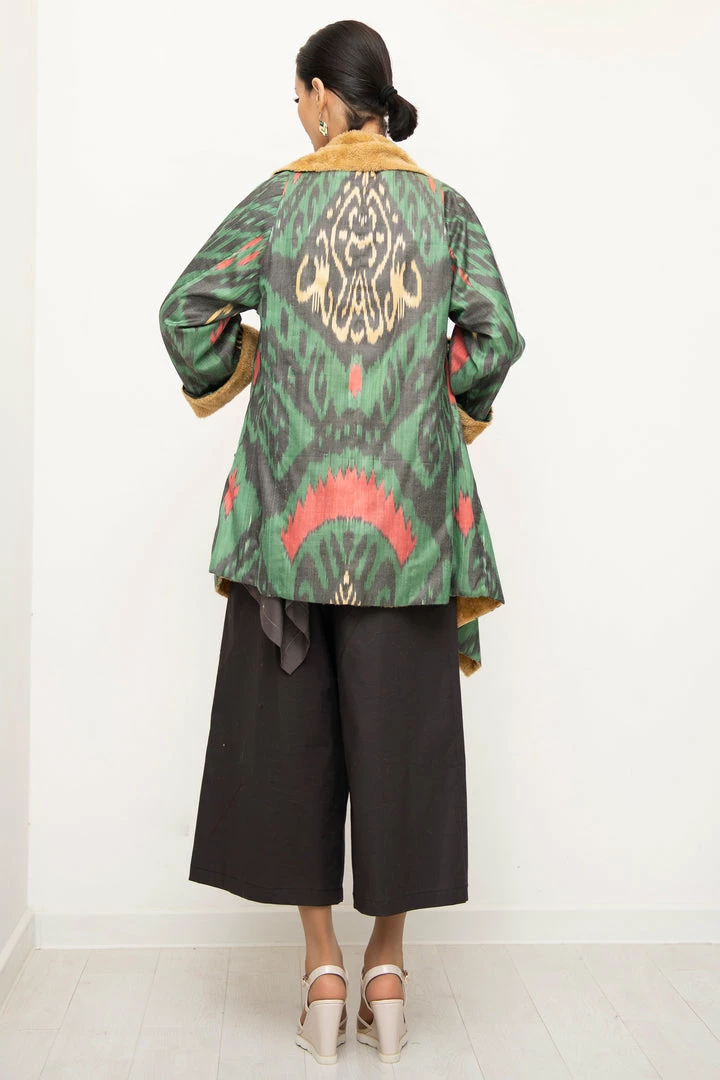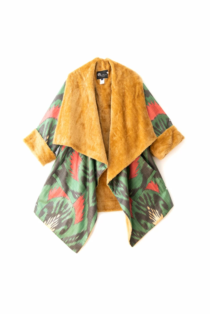 Asymmetric Ikat Jacket with its soft and light fleece lining features beautiful asymmetric cut along the collar and front. The jacket has patch pockets.Â