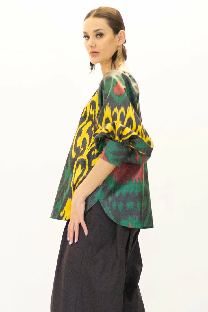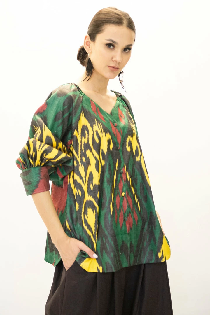 Feruza Ikat Top features heart shaped neckline with puff sleeves and folded cuffs. It has round shaped slit at the side and fabric covered buttons. The shoulder neckline areas is gathered. Other colors available.