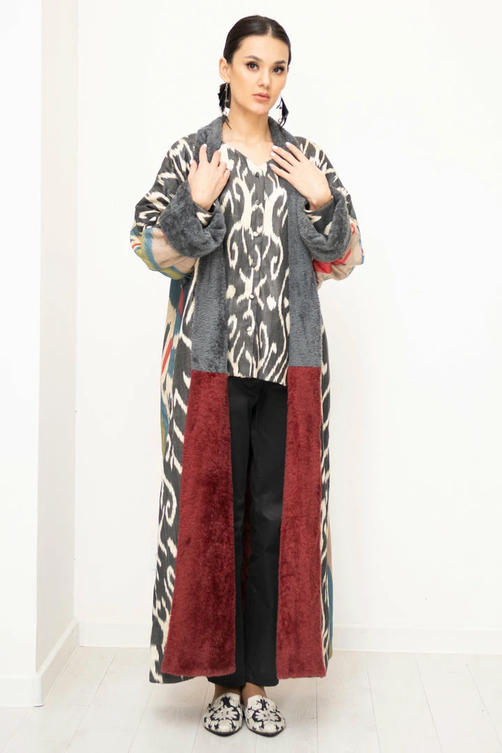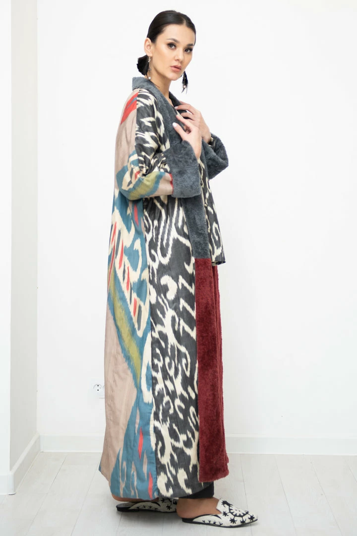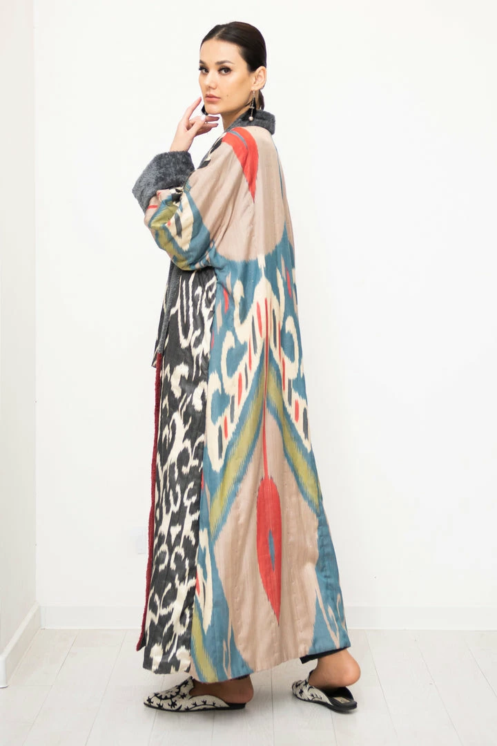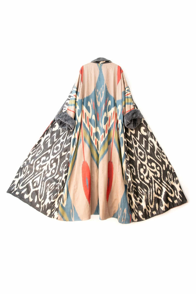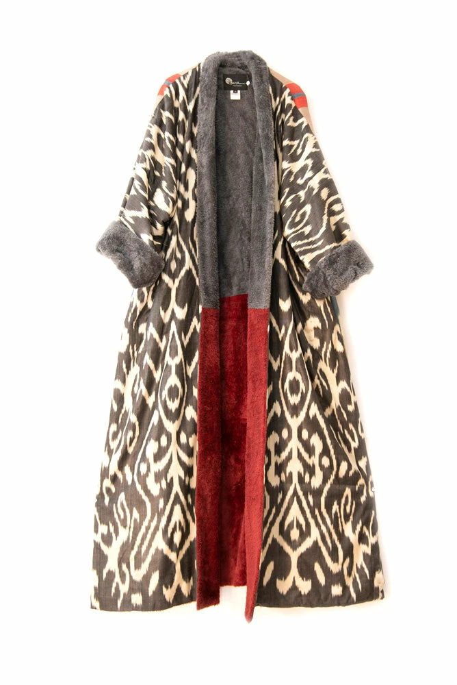 Maxi Ikat Robe lined with fleece. You can roll up the sleeves or keep it long. This robe will keep you warm in cool weather. You can wear it over any type of classic or casual outfit, it will look fantastic both ways. The wider cut will allow several sizes to fit in this robe.