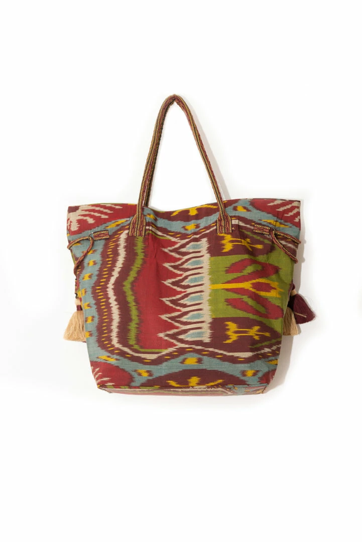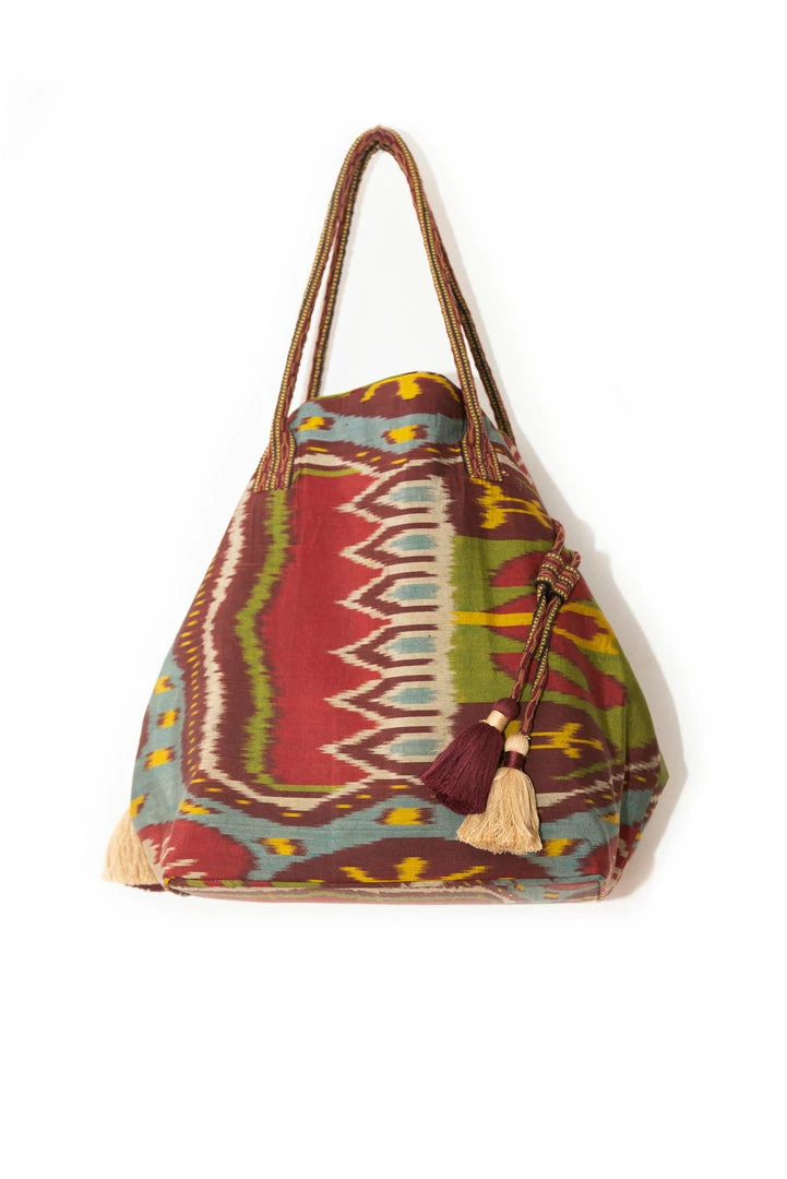 Ikat bag made with hand-woven silk ikat fabric. The side tassels help adjust the upper width of the bag. You can pull the tassels to make the bag look narrower or let it out to make it wider. The lining is made of traditional hand-made striped bekasam fabric. Inner pockets, one with zipper. Snap magnetic closure. Handles are made of hand-woven bands. This bag is a unique addition to your outfit. Match it with our ikat kaftans or contemporary outfits.