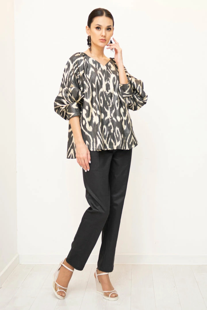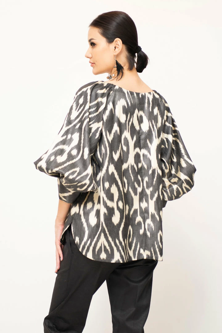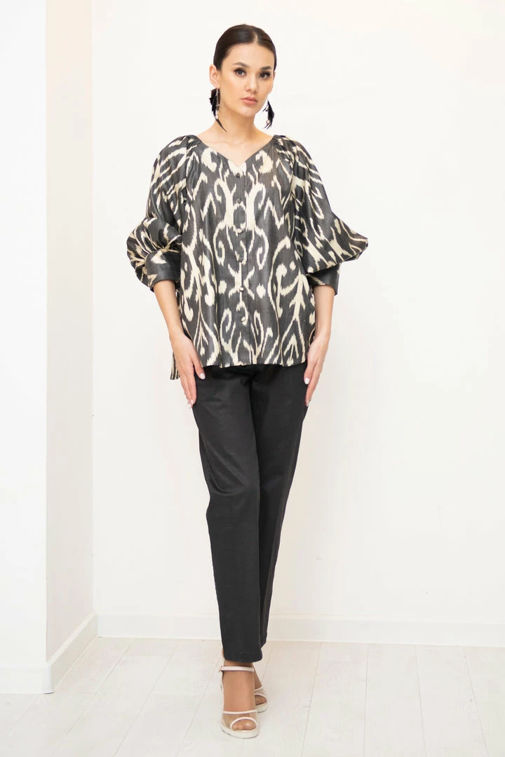Feruza Ikat Top features heart shaped neckline with puff sleeves and folded cuffs. It has round shaped slit at the side and fabric covered buttons. The shoulder neckline areas is gathered. Other colors available.