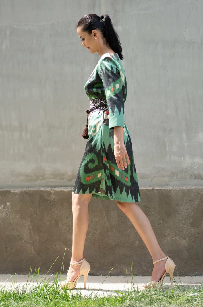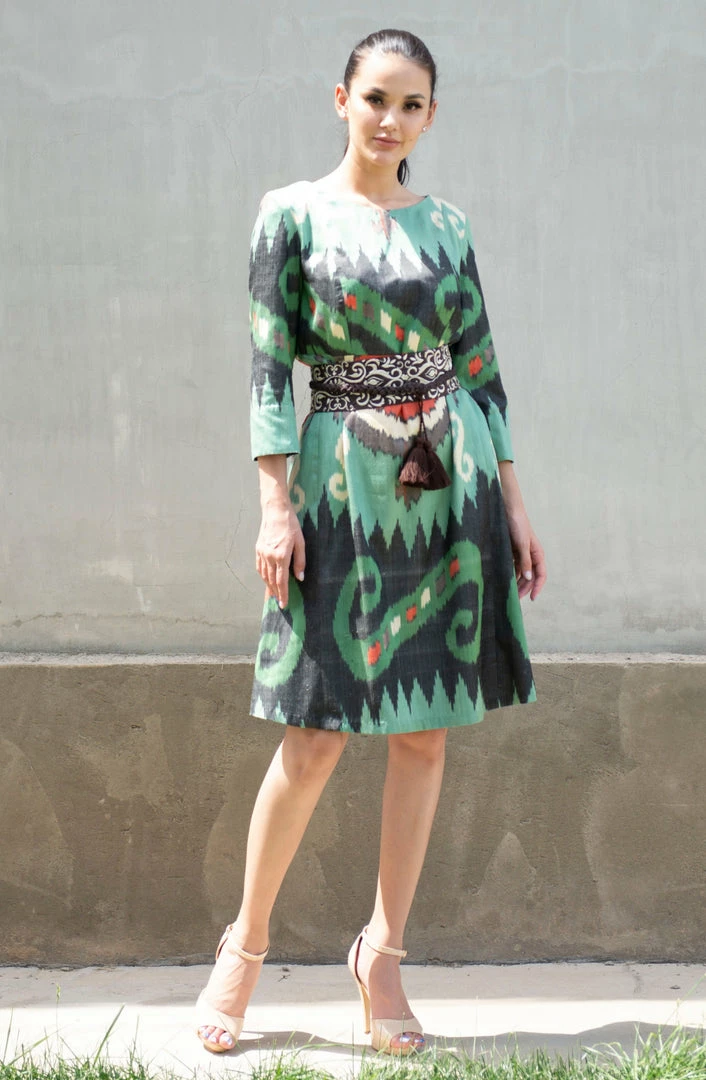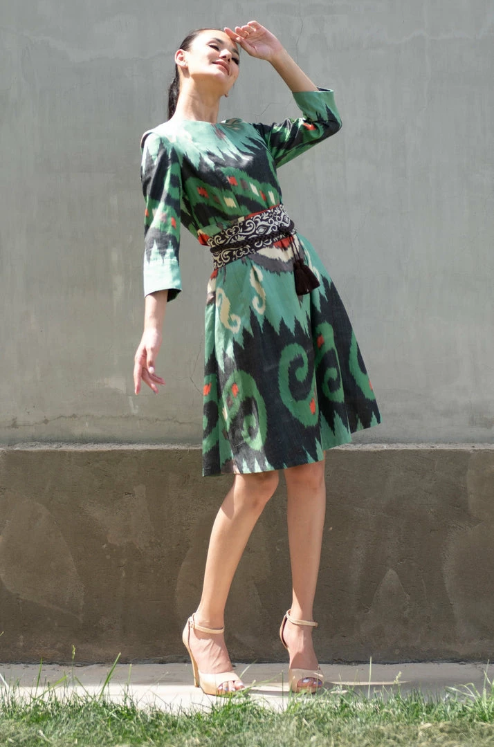Green Ikat Dress with Embroidered Belt. This ikat dress is great special occasion outfit. Slightly flared with three quarter sleeves. Back zipper. It comes with the embroidered braided belt.