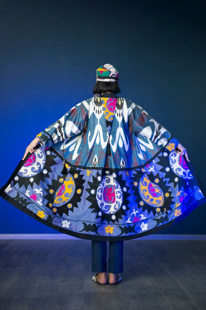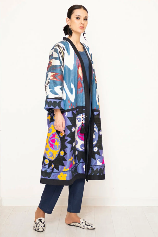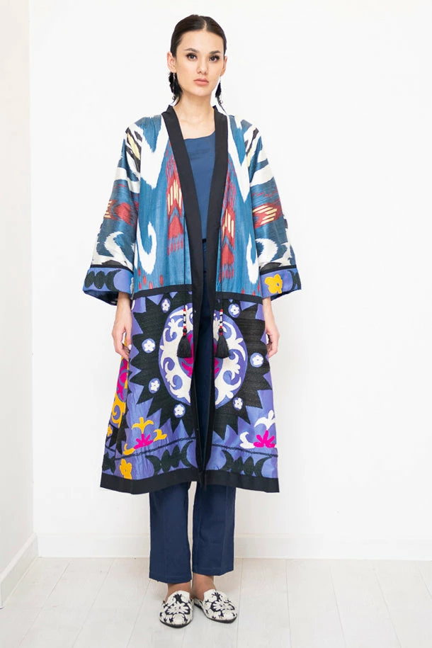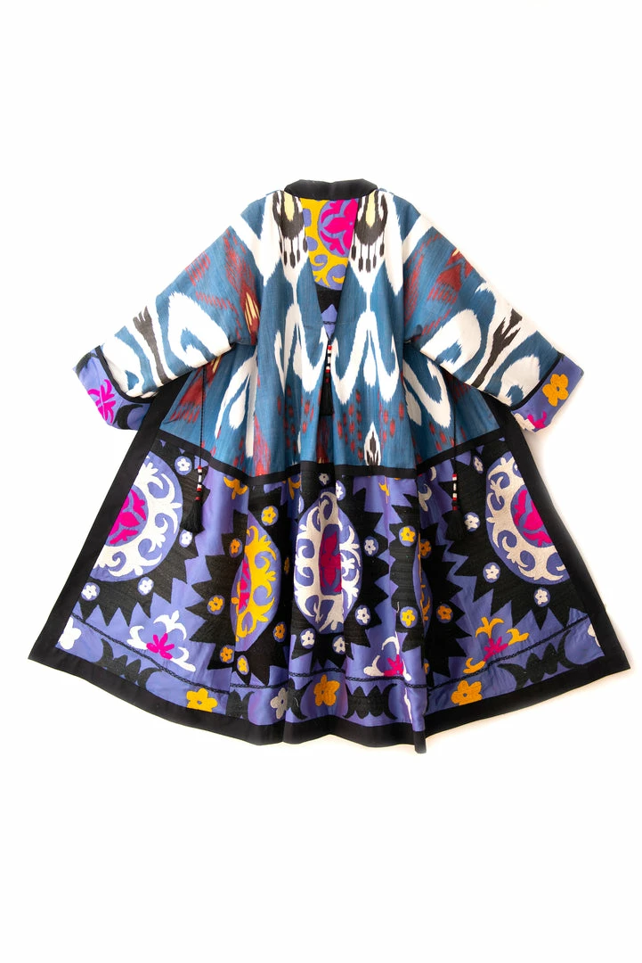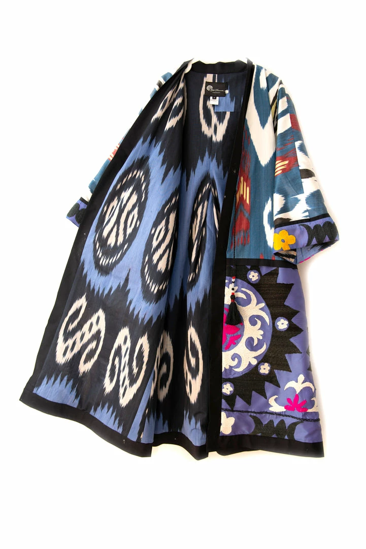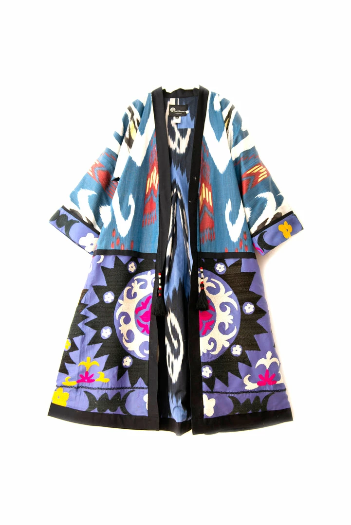 This ikat robe features beautiful vintage suzani and ikat combination, It is lined with cotton ikat fabric. Side pockets.
